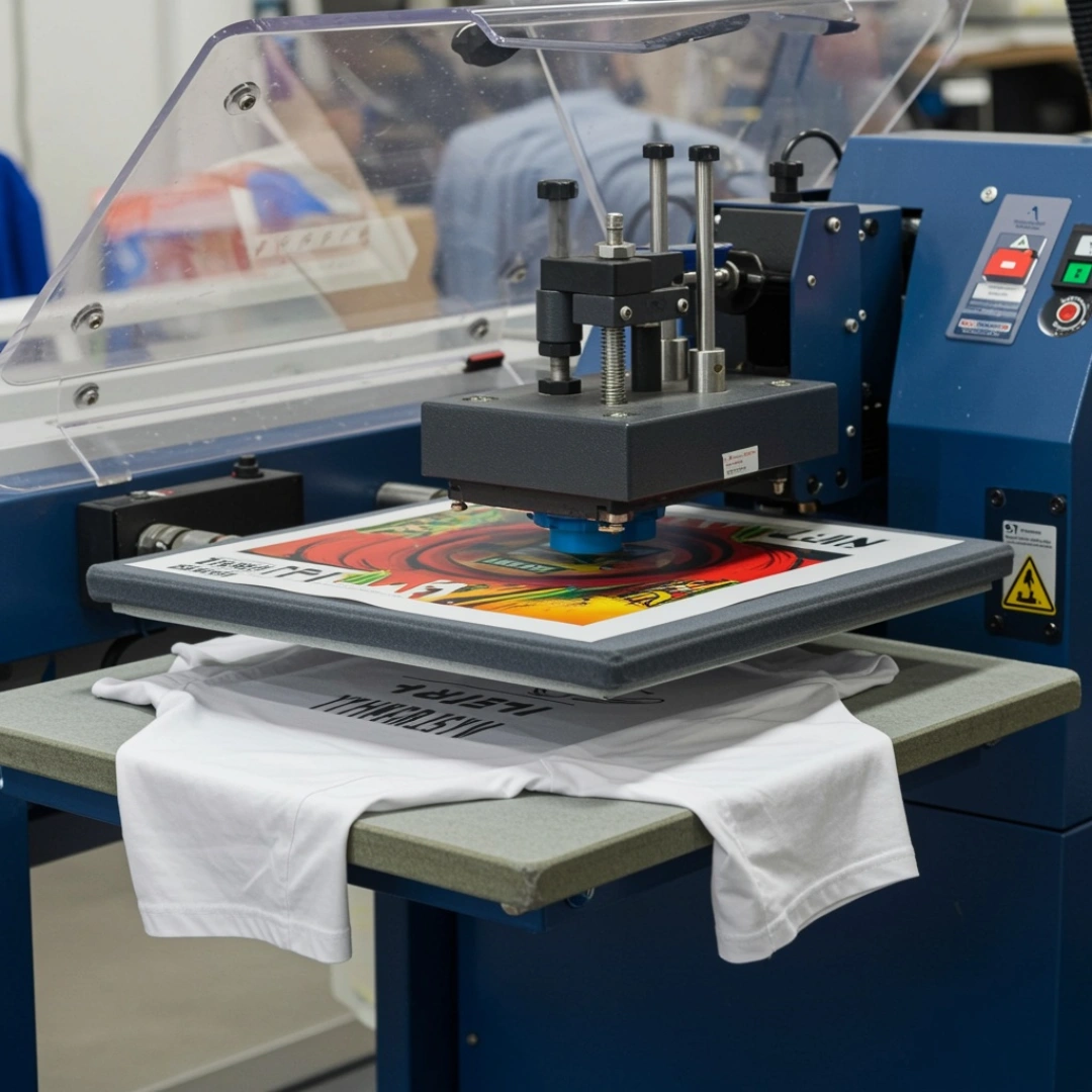 DTF t-shirt printing Dubai service showing professional equipment printing custom designs on white shirts in workshop setting